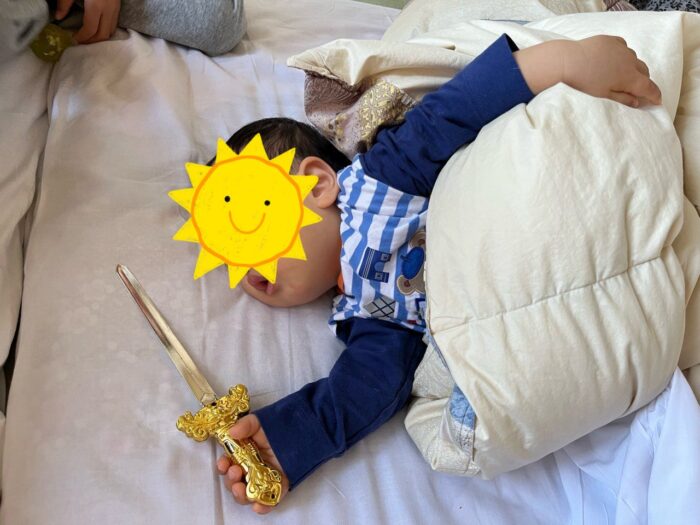 朝まだ起きていない次男に剣を持たせて遊ぶ子供たち。