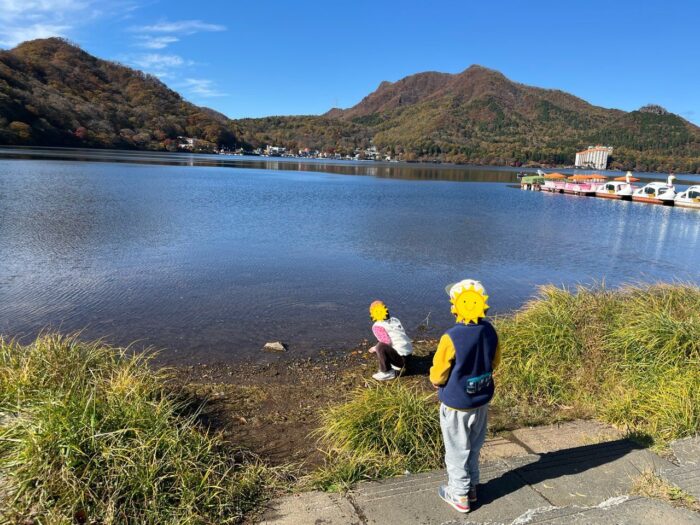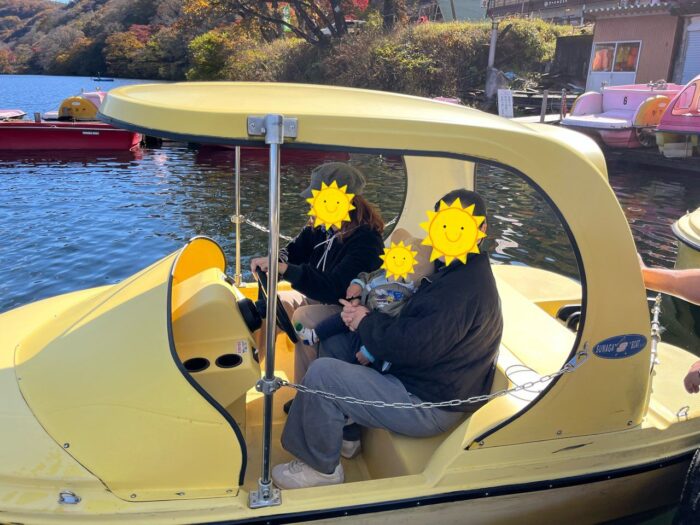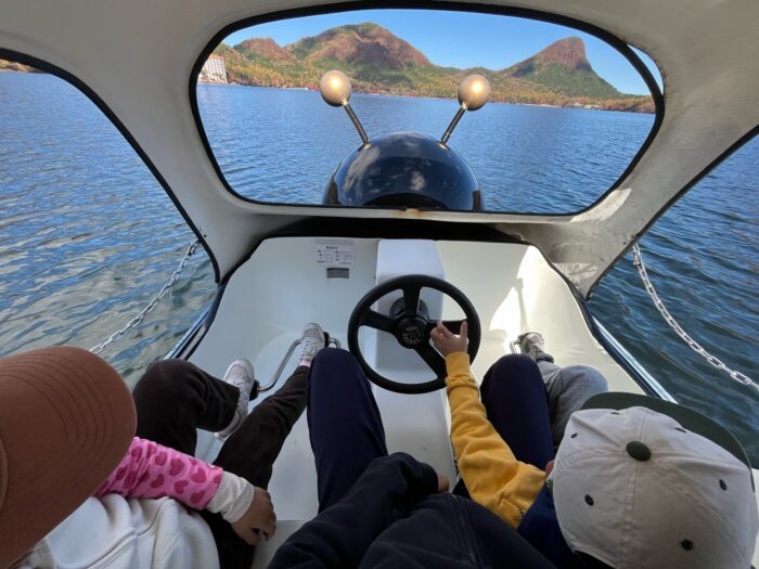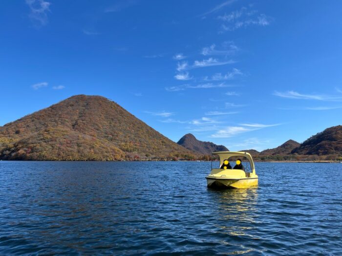 榛名湖ではボートに乗る予定だったのですが、以前利用したことのある東側のボート乗り場は休みで、湖を見渡しても一台もボートが出ていません。今日は乗れないかと諦めかけていましたが、南側中央にある甲子亭というお店の前にGoogle mapには載っていないボート乗り場を発見。誰もいませんでしたが旗が立っていたので覗きに行くと、甲子亭からスタッフの方が出てきてボートに乗ることができました。