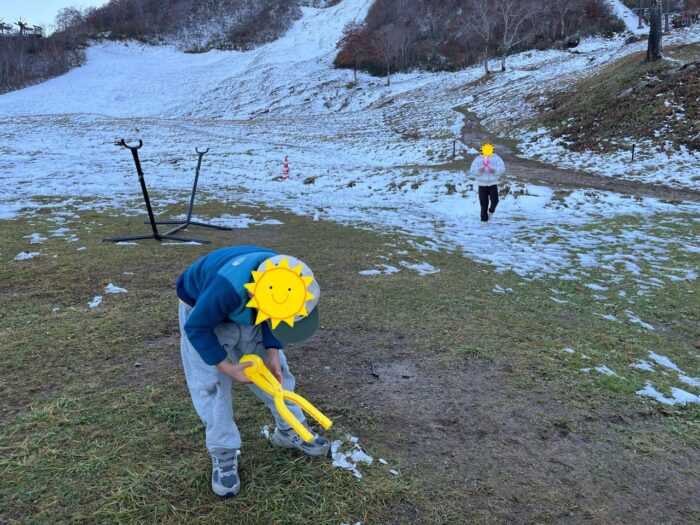 天神平駅にはハンモックやフラフープなどの遊具があります。雪投げをして遊んでいたらテレビ朝日「帰れマンデー見っけ隊!!」の撮影スタッフの方に声を掛けられ、遊んでいる様子を撮影したので番組で紹介しても良ければ同意書にサインをとのこと。こんな経験ないのでサインをして放送を楽しみにしていたのですが、11月10日の放送では隣でバドミントンをしていた人たちだけ映っていて、残念ながら我が家は映っていませんでした。